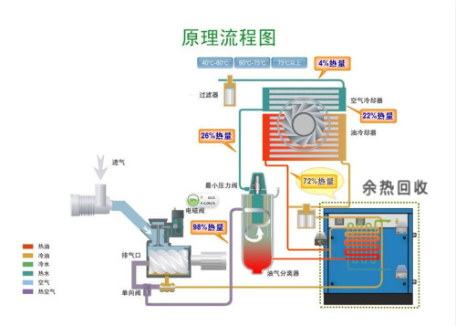 在以上過程中,高溫高壓的油、氣所攜帶的熱量大致相當(dāng)于空氣壓縮機(jī)功率的3/4其溫度通常在80℃—100℃之間。螺桿式空氣壓縮機(jī)通過其自身的散熱系統(tǒng)來(lái)給高 溫高壓的油、氣降溫的過程中,大量的熱能_被無(wú)端的浪費(fèi)了。